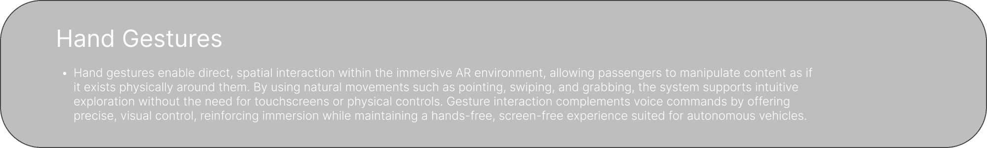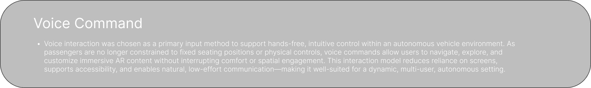 This project explores an immersive interaction system for autonomous vehicles that transforms passengers from passive riders into active participants. By combining voice commands, hand gestures, and augmented reality, the vehicle’s windows and windshield become dynamic digital surfaces that render a 360-degree visual environment. The system allows passengers to interact with information, entertainment, and surroundings in intuitive, spatial ways—redefining the in-car experience beyond traditional screens and touch-based interfaces.