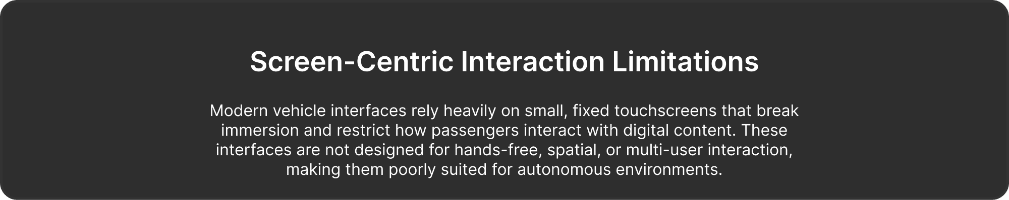 As vehicles become increasingly autonomous, passengers lose the role of “driver” but gain little in terms of meaningful interaction. Current in-car systems rely heavily on flat touchscreens that feel limiting, distracting, and disconnected from the surrounding environment. This creates a passive, screen-bound experience that fails to take advantage of the vehicle’s physical space or the passenger’s full range of interaction.