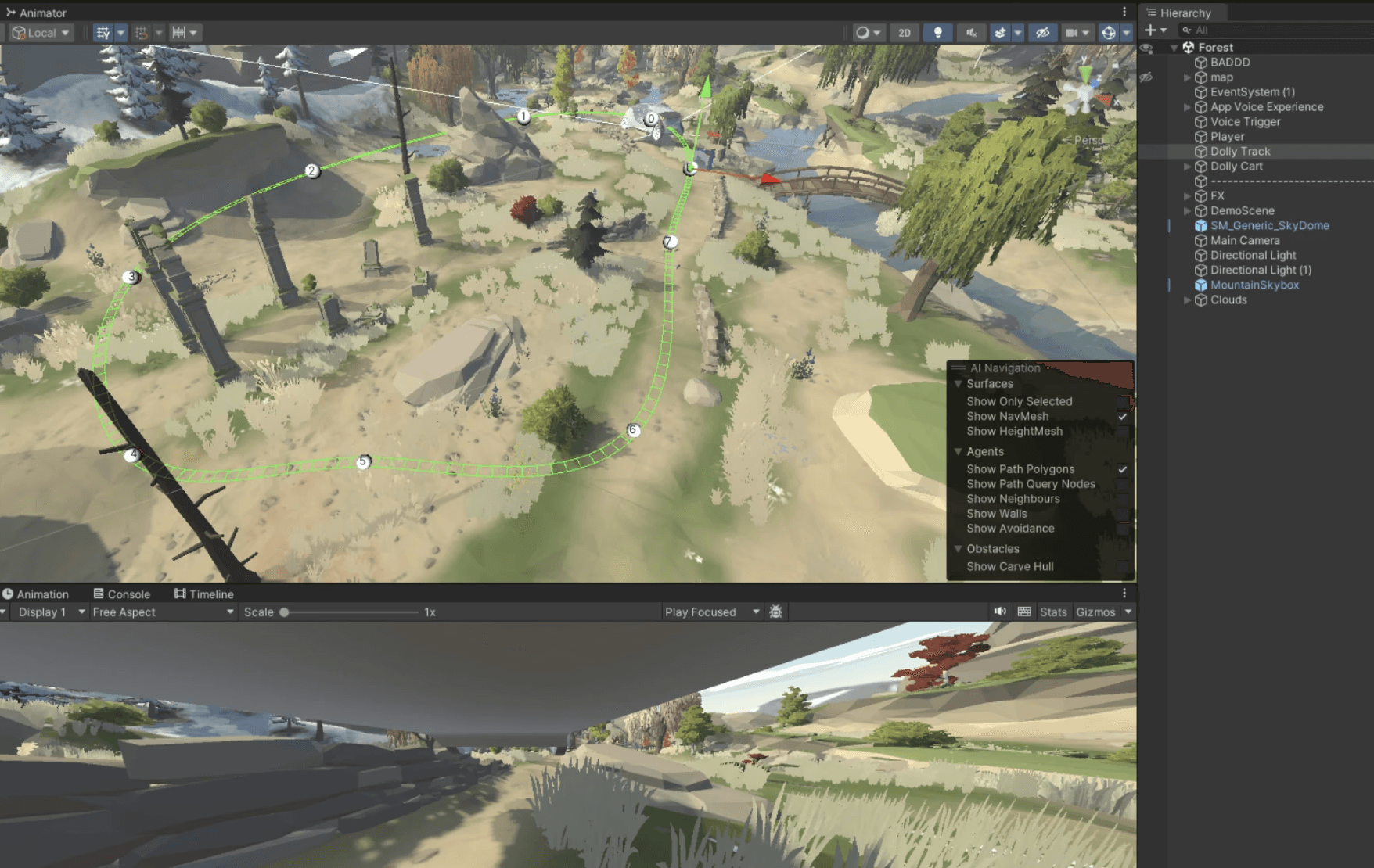 We created a giant sphere and put the car inside it. When the user grabs the small ball in front of them, the giant sphere outside the car changes to show the selected environment.