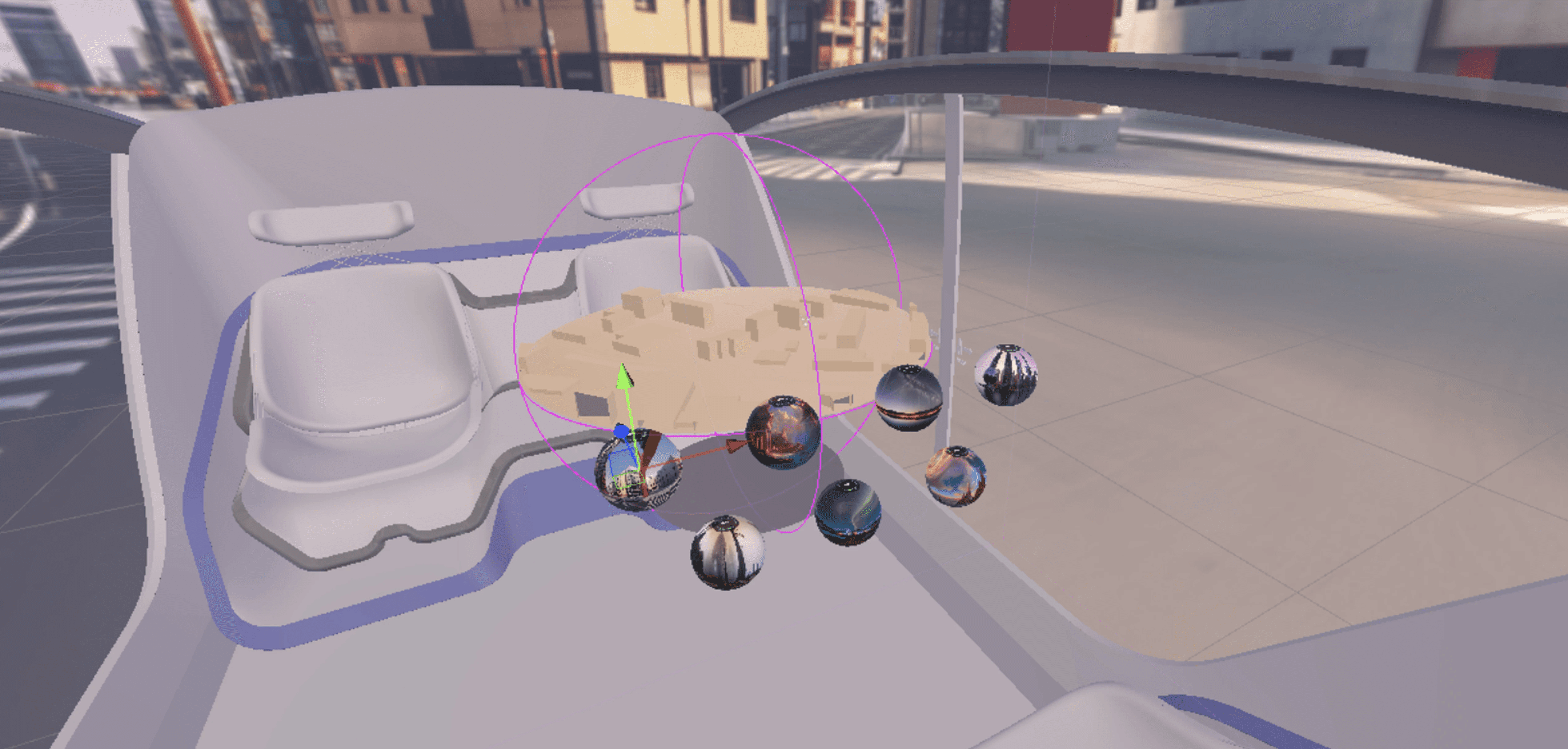 Instead of just changing the image on the sphere, why not simulate the car driving through a real-time, dynamic environment, so as to create a realistic sense of feeling in the virtual world? We created a giant sphere and put the car inside it. When the user grabs the small ball in front of them, the giant sphere outside the car changes to show the selected environment.